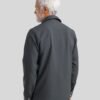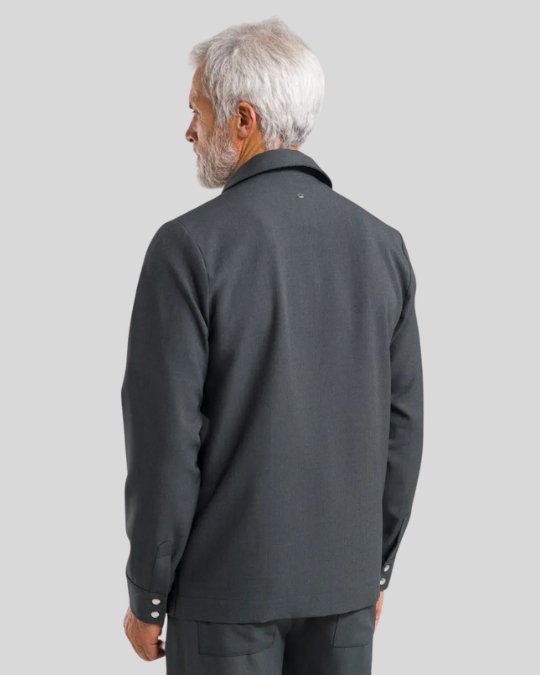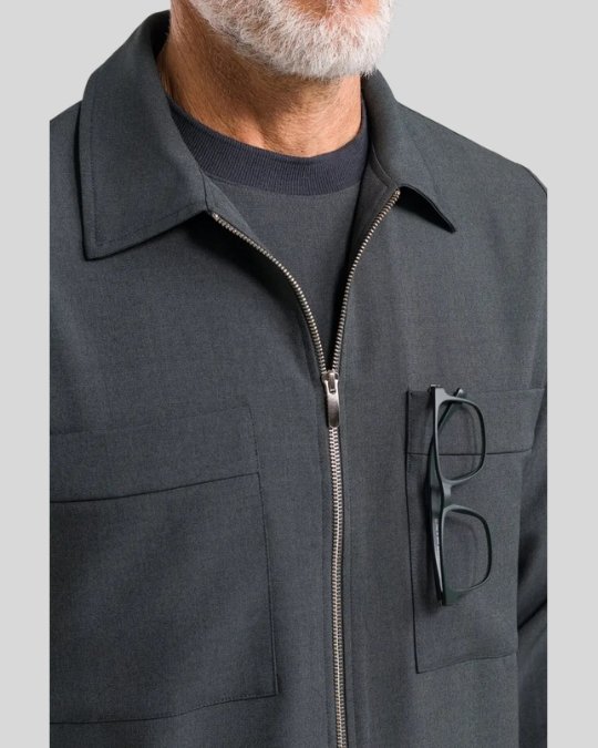 Chaqueta confeccionada en material 95% poliéster y 5% elastano. Cuenta con cuello camisero, cremallera de metal frontal, bolsillos superpuestos, puños con cierre de botón y una etiqueta tipo clip externa en el dobladillo.