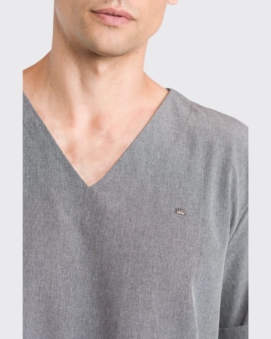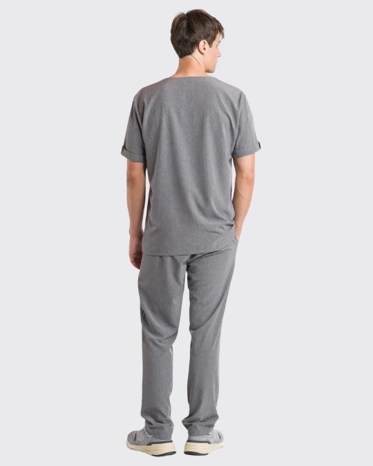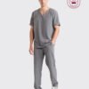 El Scrub Masculino Easy está confeccionado en material con 90% poliéster y 10% elastano, con tecnología easy care. Cuenta con blusa de cuello en “V”, mangas cortas con dobladillo italiano y martingala. El pantalón tiene pretina con resorte, bolsillos laterales, pierna recta y corte lateral.