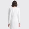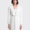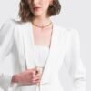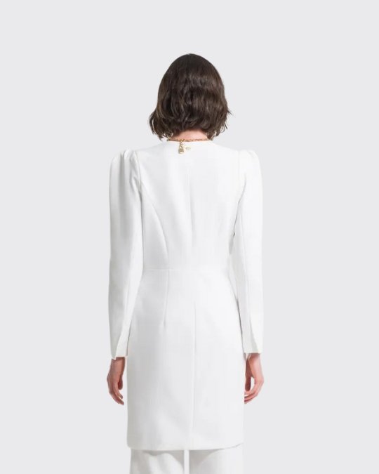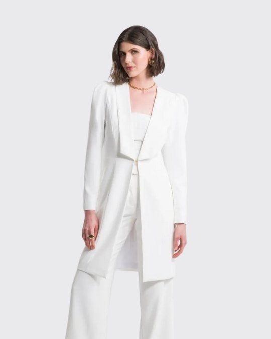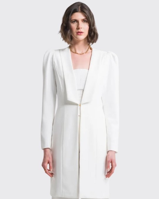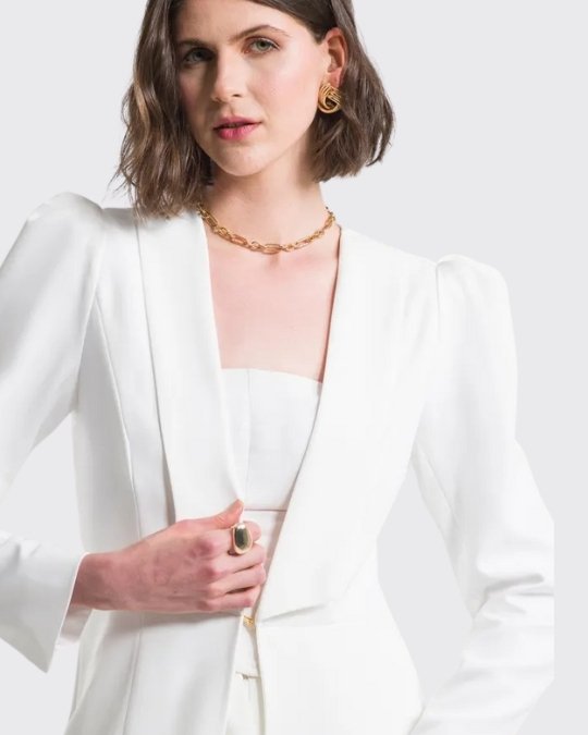 Cuenta con mangas abullonadas, cuello tipo chal con puntas cuadradas y cierre con gancho. Sus cortes y su diseño realzan la silueta, haciéndola entallada y aún más femenina.
