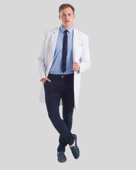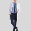 Confeccionada en tejido de algodón con elastano, el material elegido posee un gramaje más pesado para otorgar al producto la estructura que necesita. Los cierres son mediante botones frontais; posee bolsillos inferiores grandes, profundos y funcionales, además de un bolsillo superior con espacio para bolígrafo.