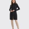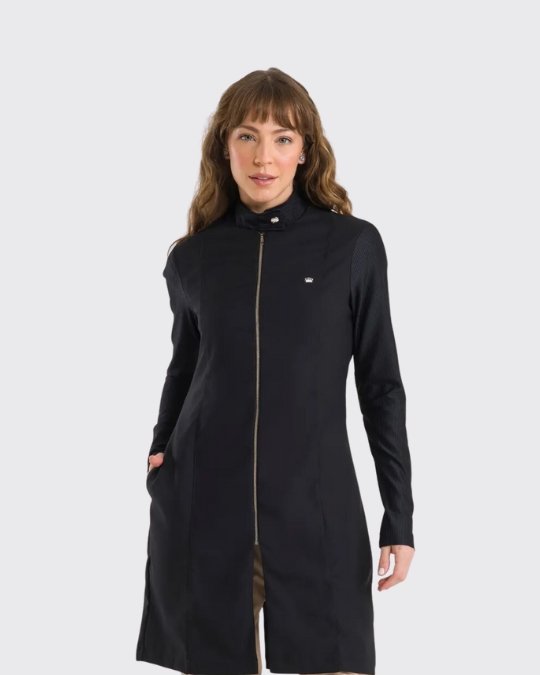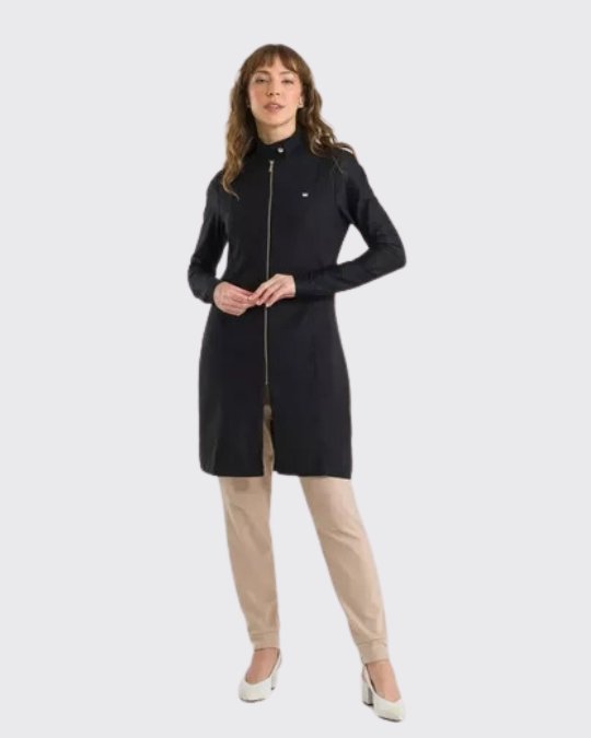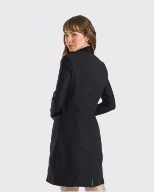 La Bata Stylish está confeccionada con una mezcla de tejidos que combinan perfectamente entre sí: tejido de punto acanalado en las mangas y el cuello, y tejido plano en el cuerpo, tanto al frente como en la espalda, creando una apariencia elegante, reforzada por el cuello alto cruzado y asegurado con botón de presión. El cierre de la bata es con cierre metálico y su corte slim resalta el detalle del tejido acanalado brillante.