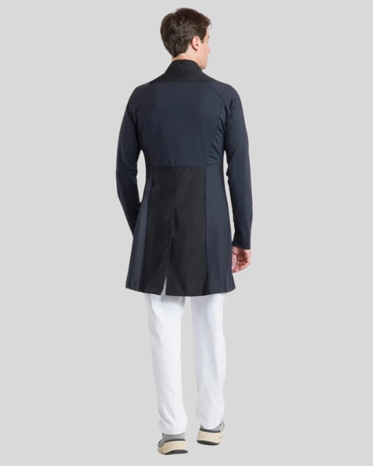 Esta bata está confeccionada con elastano premium y un tejido tecnológico en las zonas de la espalda y los brazos —similar al utilizado en ropa de alto rendimiento—, que ofrece una movilidad superior y confort térmico. Este innovador tejido ayuda a activar la circulación sanguínea y regula la temperatura corporal, garantizando una frescura constante durante toda la jornada.